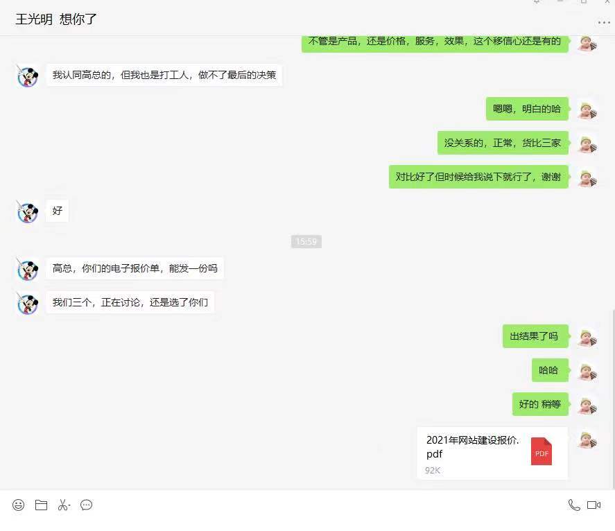 到了第二天,老板又找了四家对比。不过最后还是确定下来和我们合作,我们相信效果和服务好了,价格在一个合理的范围,都是能接受的,不对对比,就怕不比。