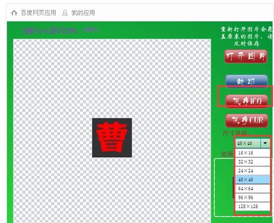 打开图片,把存放在本地电脑上那个图片导入进来,看我导入我自己的是这个样子的,以“曹”字为例,选好尺寸为16*16,然后保存ICO,就可以把ICO文件保存好到本地,将转换好的ico文件改名为favicon.ico,这个文件也就算是完成了,看下图所示: