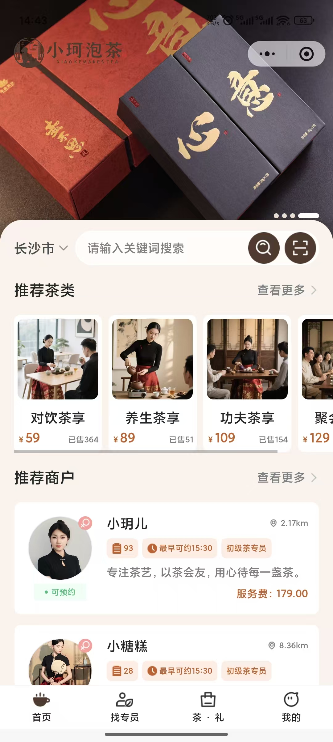 这我们开发的一套上门茶艺小程序和APP案例,包含用户端,茶艺师端和管理端,核心功能是预约上门、茶艺服务和茶礼销售。包含了客户很多自定义的逻辑,目前只是在长沙运营,试运行成功后会开放加盟面向全国。