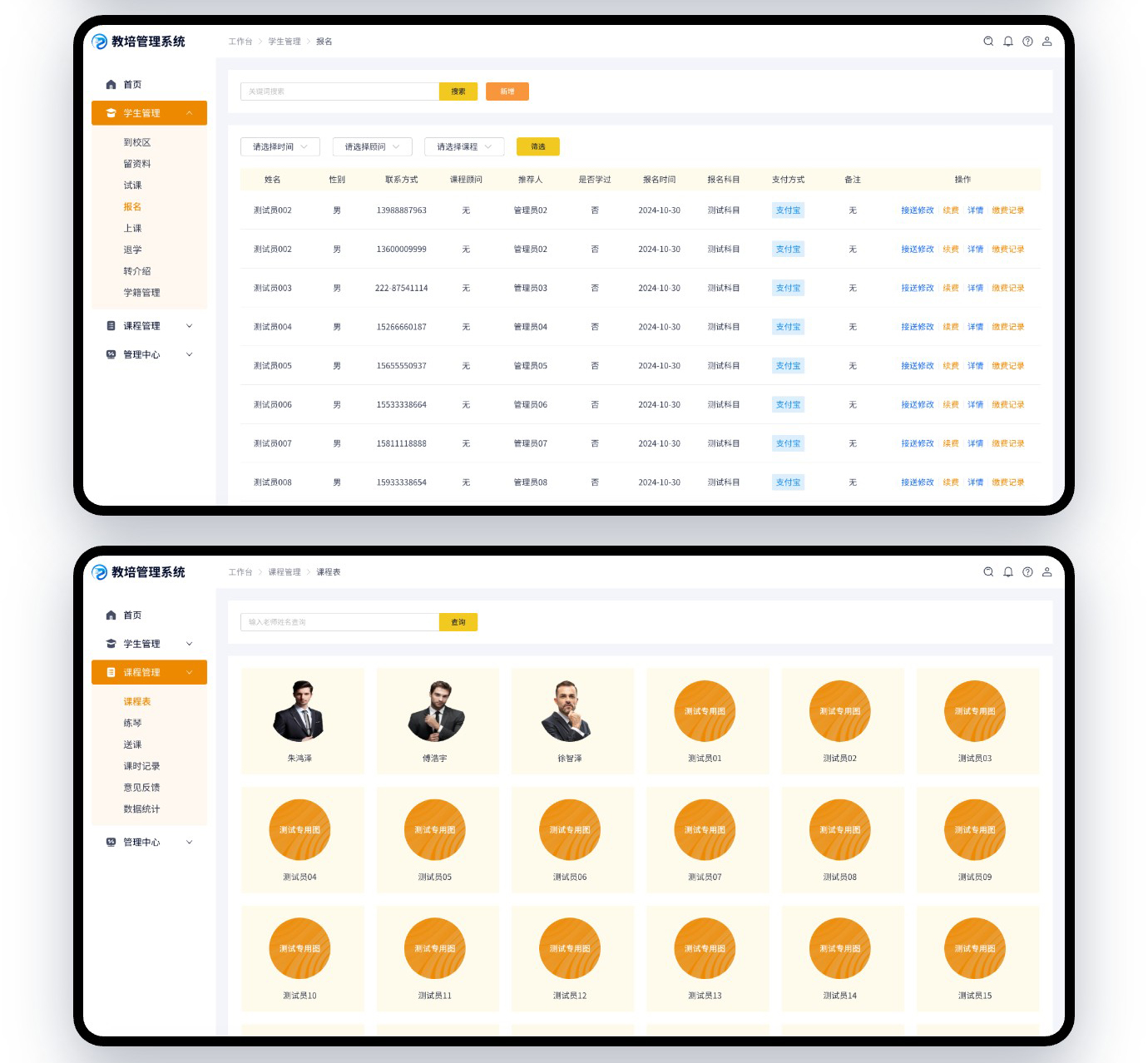 这是我们给广东以为客户开发的教培管理系统,功能不算复杂,常规的排课系统、财务管理、人事管理、资料管理、学籍管理、课程管理都是有的。目前第一阶段只开发了PC管理端,如果运营能达到预期会进入第二期小程序端或者APP端开发。